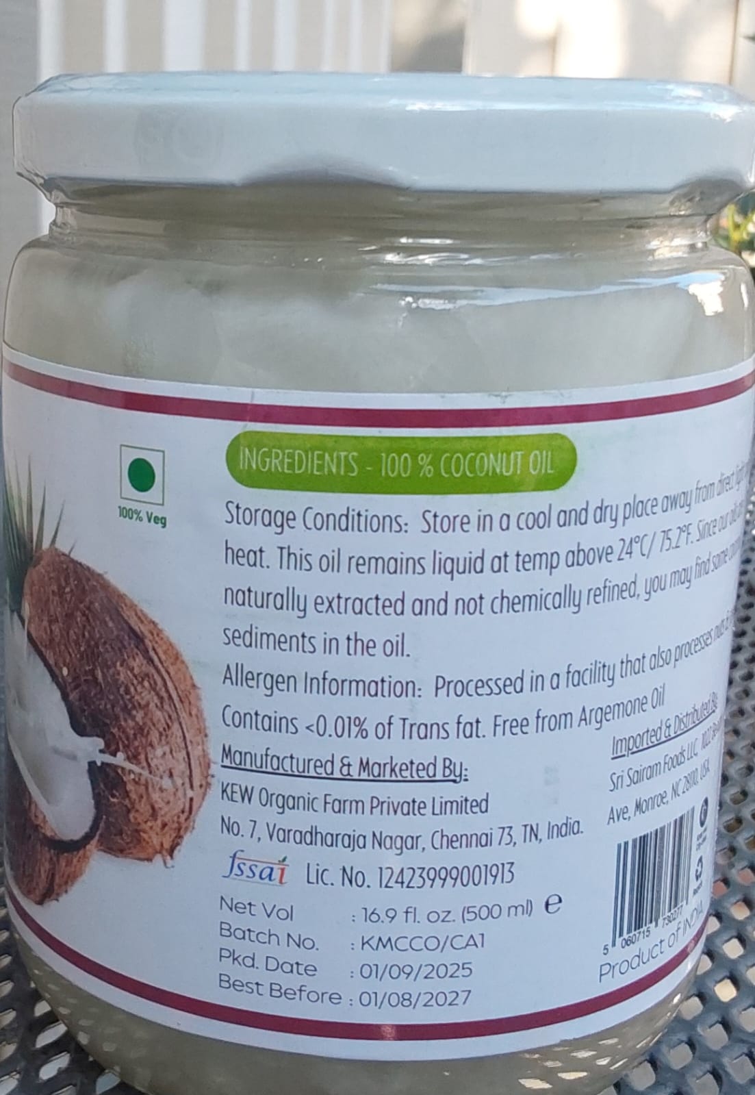 Cold Pressed Coconut oil 0.5L in glass Jar
